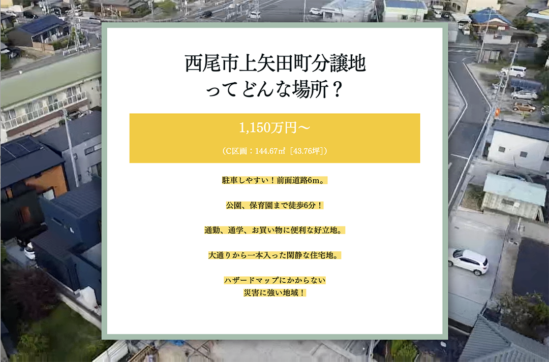 ●所在地/愛知県西尾市上矢田町切神・北野 ●交通/名鉄西尾線「福地」駅 約徒歩24分 ●区画数/17区画 ●地目/宅地 ●都市計画:市街化区域 ●用途地域/第1種住居地域 ●建ぺい率/60% ●容積率/200% ●接道/幅員約6mの公道に接道 ●設備/上・下水道・都市ガス ●土地面積/144.52㎡(43.71坪)~186.75㎡(56.49坪) ●販売価格/1,050万円~1,600万円 ●販売形態/仲介※株式会社シンカアセットマネジメント(高浜市神明町1-1-24/TEL:0566-53-6061/宅地建物取引業:愛知県知事(3)第21977号) ●取引形態/仲介 ●取引条件/株式会社シンカによる建築条件付き ●開発行為許可番号/4令西建第8-20号 ●広告有効期限/2025年12月31日