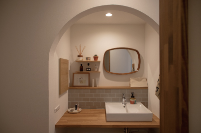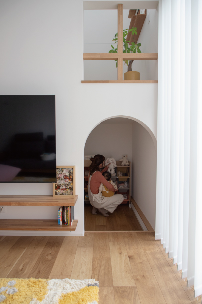 ナチュラルで可愛い雰囲気のアーチ、帰ってすぐに見えるおしゃれな造作洗面、柔らかく温かい日がさす大きな窓、リビング全体が見渡せるキッチン、一回座ったらホッと一息つけるダイニングなどなど。